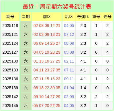 本期在星期六进行开奖,把柄上方【最近十个星期六奖号统计表】可知,上周六前区奖号为05、07、20、22、25,奇偶比为3:2,最近十个星期六开出的前区奇偶比为29:21,本周六展望奇偶比为4:1。