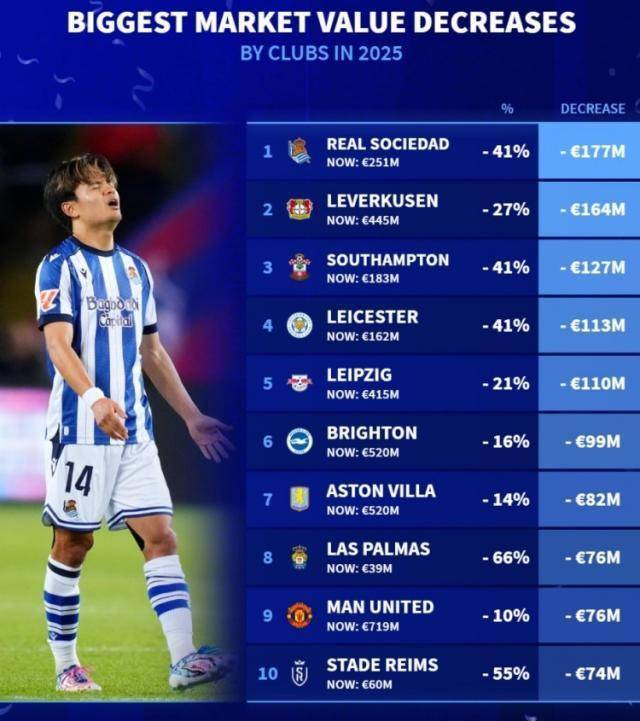 2025年还是完满,《转会市集》也统计了年度球队身价贬值榜,皇社、药厂分列前二。2025球队身价贬值榜:欧元