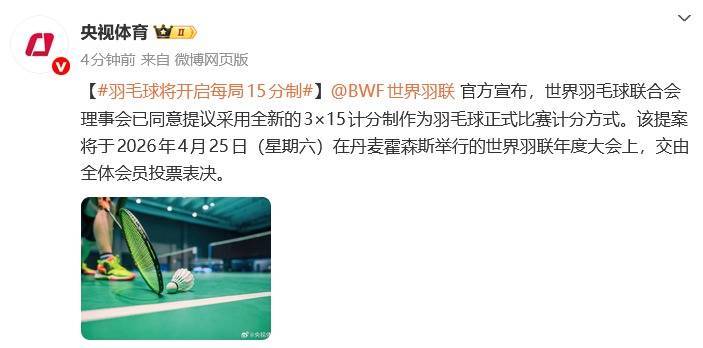 据@央视体育 12日音书,全国羽联官方通知,全国羽毛球连络会理事会已欢喜提出聘任全新的3×15计分制行为羽毛球负责比赛计分时势。
